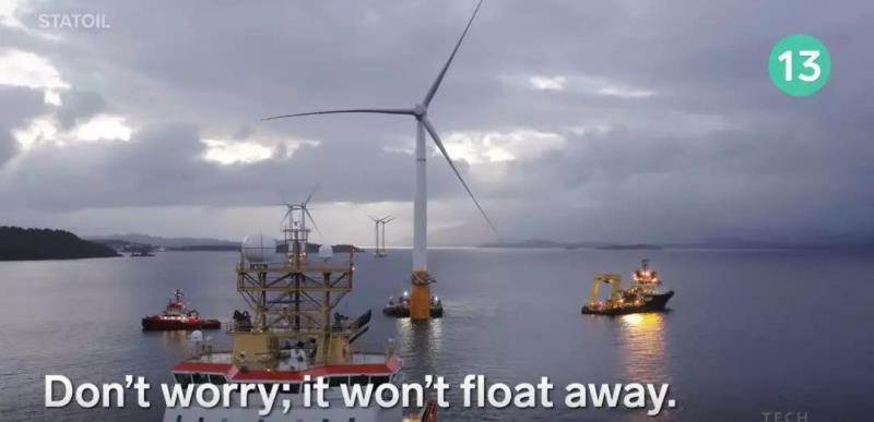 13. 這個蘇格蘭的浮動風(fēng)電場是第一個這樣的。別擔(dān)心:它不會飄走。它由海床上的吸力固定器固定,一年可以為2萬戶家庭供電。