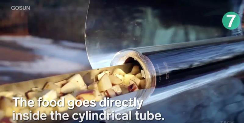 7. GoSun Grill使用陽光供電。反射器將太陽的光線聚焦在金屬管上......產(chǎn)生高達(dá)550°F的烹飪溫度。食物直接進(jìn)入圓柱形管內(nèi)。
