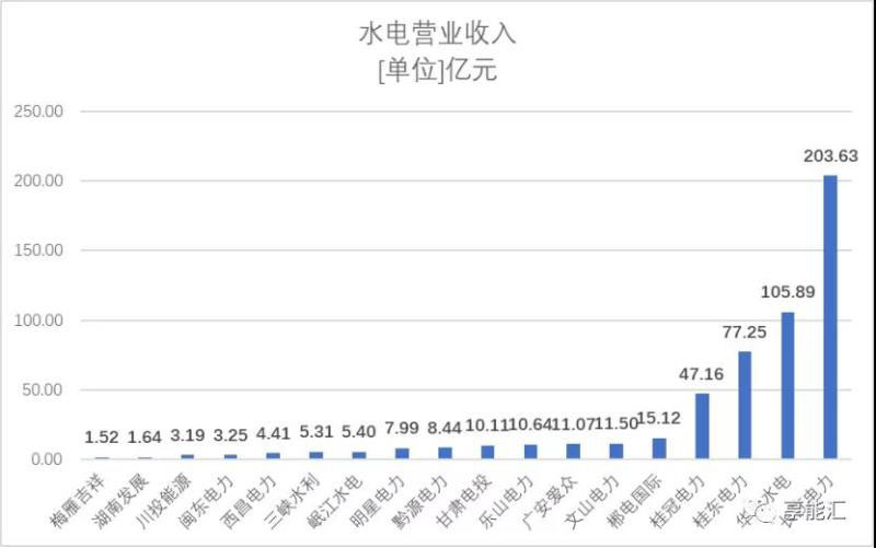 從水電上市企業(yè)財(cái)務(wù)中報(bào)選取營業(yè)收入科目,其中長江電力以203.64億元營業(yè)收入位于行業(yè)首位,而營業(yè)收入第二位的華能水電中報(bào)收入105.89億元,與長江電力相差近一倍。從上圖可以看到水電行業(yè)分化嚴(yán)重,主要的營收都集中在幾家龍頭企業(yè)上面。