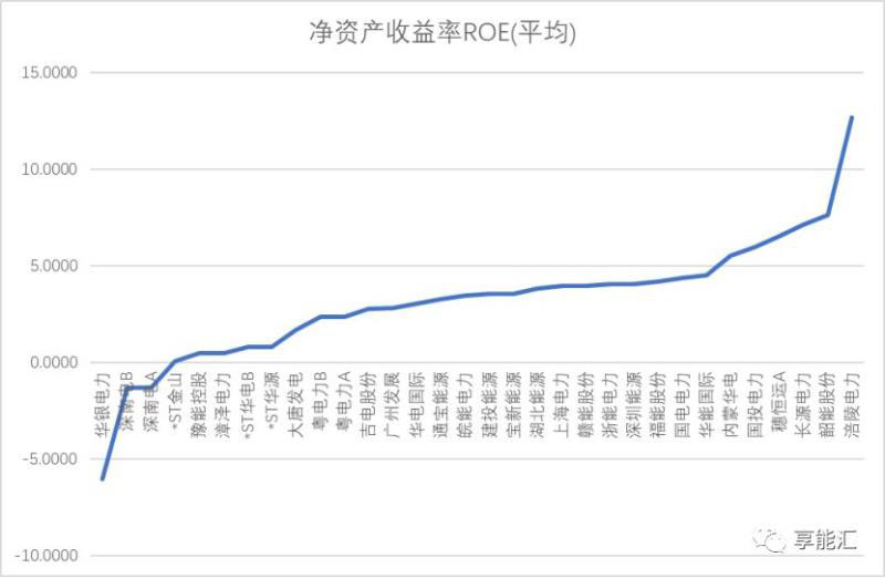 在電力行業(yè)上市企業(yè)中,凈資產(chǎn)收益率最高的涪陵電力ROE達(dá)到了12.69%,其次為韶能電力和長源電力,分別為7.67%和7.15%。裝機(jī)量最高的華能國際凈資產(chǎn)收益率為4.51%,高于行業(yè)平均水平。在電力行業(yè)32家上市企業(yè)中,14家企業(yè)低于行業(yè)平均ROE3.1763%(享能匯計(jì)算),18家企業(yè)高于行業(yè)平均ROE(圖8所示)。