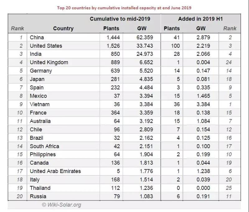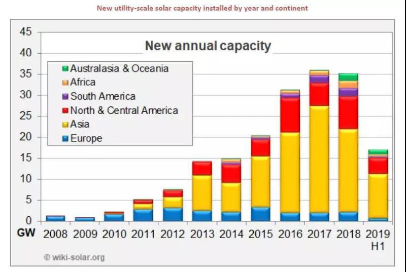 根據(jù)Wiki-Solar發(fā)布的消息,2019年上半年盡管以越南為首的新興光伏市場出現(xiàn)了爆炸式增長,但全球公用事業(yè)規(guī)模的光伏裝機增速放緩。