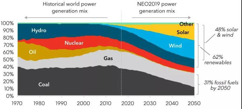 《2019年新能源市場長期展望》報告是由彭博新能源財經(jīng)(BNEF)發(fā)布的權(quán)威全球旗艦報告。借助全球超過65位技術(shù)、經(jīng)濟和政策專家的專業(yè)知識,該報告及相應(yīng)的互動工具既模擬了各國電力系統(tǒng)的中長期演變,也預(yù)測了不同能源技術(shù)的成本下降路線。全面覆蓋風(fēng)電、光伏、電動汽車、儲能、傳統(tǒng)能源、離網(wǎng)電力、新興技術(shù)等行業(yè),并結(jié)合了各國的政策、基礎(chǔ)設(shè)施、供應(yīng)鏈、消費者偏好、技術(shù)發(fā)展以及出行需求等因素,綜合判斷新能源的長期發(fā)展方向。