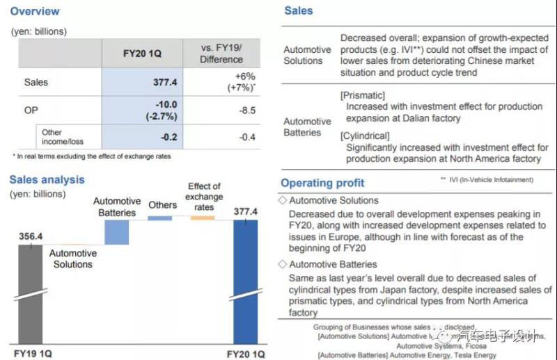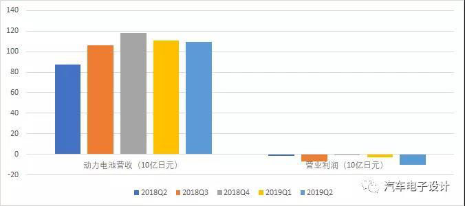 松下2019 的業(yè)績情況,汽車業(yè)務(wù)整體營收 3774 億日元,營業(yè)利潤虧損 100 億日元,虧損同比擴(kuò)大 5.7 倍。汽車業(yè)務(wù)中動(dòng)力電池業(yè)務(wù)營收 1092 億日元,同比增長25%,環(huán)比下降1.5%。