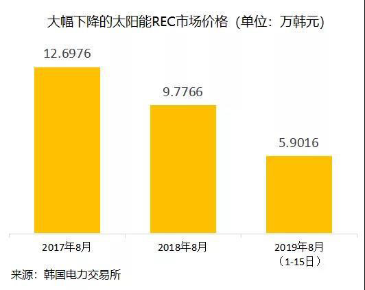 韓國電力交易所表示,本月1日至15日,太陽能REC的平均市場價(jià)格已跌至5.9016萬韓元(約合人民幣343.3元)。與2017年8月高達(dá)12.6976萬韓元(738.8元)的價(jià)格相比,跌幅超過50%。而在去年上半年,這一價(jià)格還曾超過10萬韓元(581.8元)。短短兩年時(shí)間,價(jià)格腰斬過半,讓依賴補(bǔ)貼的韓國光伏市場陷入不安。