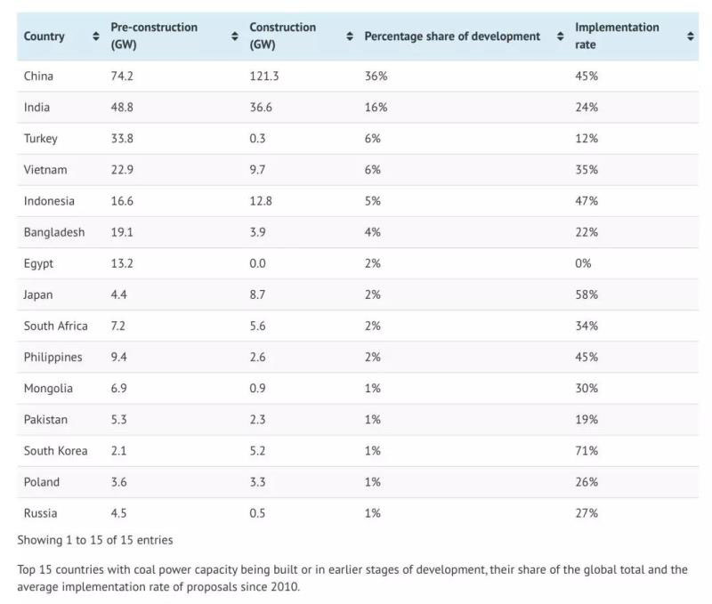 從正在建設(shè)和規(guī)劃的煤電產(chǎn)能來(lái)看,新增煤電也將集中在15個(gè)國(guó)家(486吉瓦),占全球目前正在開發(fā)的所有煤炭產(chǎn)能(538吉瓦)的90%: