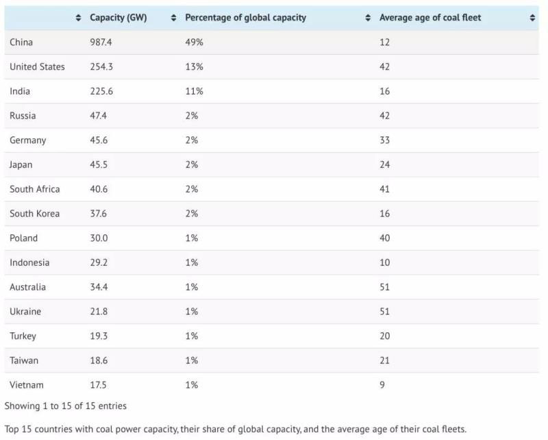 到2019年6月底止,在全球范圍內(nèi)煤電裝機(jī)主要集中在15個(gè)國(guó)家(1845吉瓦),占全球總裝機(jī)(2027吉瓦)的91%。這15個(gè)國(guó)家和地區(qū)是: