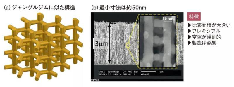 然而,IMEC也有表示在五年內(nèi)實現(xiàn)2~3 C的快速充電。2019年3月,該公司公布了其中一個技術(shù)(圖4)。它是一種“納米網(wǎng)狀電極”(IMEC),具有常規(guī)的氣隙,最小尺寸約50nm,非常小,具有多孔柔韌的特性?!斑@樣,即使在快速充電期間也可以抑制金屬Li負(fù)極的枝晶”(IMEC)但是,沒有公開原因的細(xì)節(jié)。