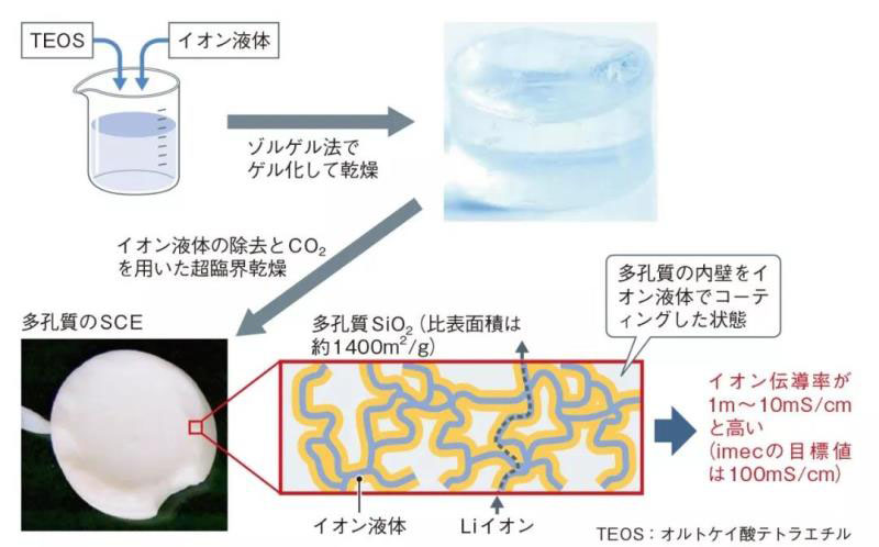 更詳細(xì)的IMEC電解液制造工藝:在將離子液體與Si基材料的TEOS(原硅酸四乙酯)混合后,通過加入水等使其凝膠化,然后去除水分。此外,在CO2氛圍下進(jìn)行超臨界干燥,形成主要成分為SiO2的多孔材料。由于離子液體結(jié)合到孔的表面增強了Li離子的導(dǎo)電性。