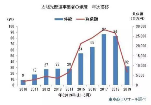 2019年上半年(1-6月),光伏行業(yè)企業(yè)的破產(chǎn)32家,與去年同期相比減少25.6%,已連續(xù)2年呈現(xiàn)下降趨勢(shì)。企業(yè)負(fù)債總額為68億6400萬日元(約合人民幣4.4億元),較去年同期減少55.2%。