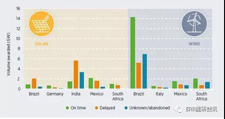圖10 所選國(guó)家的太陽(yáng)能光伏和風(fēng)能拍賣的建設(shè)和延遲