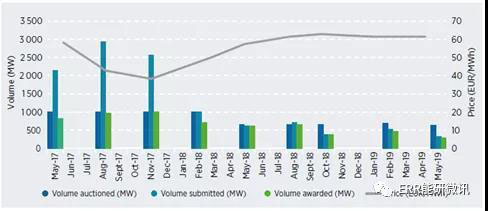 圖8 2017年5月~2019年5月,德國(guó)陸上風(fēng)電拍賣認(rèn)購(gòu)不足導(dǎo)致價(jià)格上漲