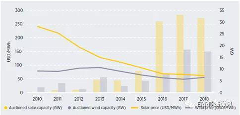 太陽(yáng)能光伏是最廣泛的拍賣技術(shù)。幾乎一半的太陽(yáng)能光伏拍賣都發(fā)生在南亞、東亞和太平洋地區(qū),其余大部分的拍賣發(fā)生在歐洲。由于太陽(yáng)能資源的巨大稟賦和技術(shù)成本的下降,太陽(yáng)能光伏正與這些地區(qū)的傳統(tǒng)能源競(jìng)爭(zhēng)。中國(guó)以67.8美元/兆瓦時(shí)的平均價(jià)格授予5千兆瓦太陽(yáng)能光伏,共10次拍賣(Climatescope,2018年)。菲律賓以43.9美元/兆瓦時(shí)的低價(jià)競(jìng)標(biāo)50兆瓦(Billini,2018年)。