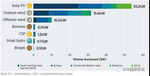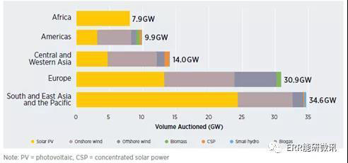 2017~2018年非洲、亞洲和太平洋地區(qū)的其他國(guó)家進(jìn)行的拍賣,重點(diǎn)是太陽(yáng)能光伏和陸上風(fēng)電。 歐洲仍然專注于針對(duì)大型項(xiàng)目的特定技術(shù)拍賣,而拉丁美洲繼續(xù)在拍賣設(shè)計(jì)中開(kāi)拓和創(chuàng)新,并繼續(xù)傾向于技術(shù)中立。