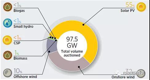 大多數(shù)可再生能源拍賣仍然專注于成熟的發(fā)電技術(shù)。2017 - 2018年,預(yù)計(jì)總發(fā)電量為97.5吉瓦(GW),其中太陽(yáng)能光伏(PV)和陸上風(fēng)電占總體積的一半以上,幾乎占總量的三分之一(圖1)。 海上風(fēng)電的數(shù)量大幅增加,最近在新的國(guó)家舉行了聚光太陽(yáng)能發(fā)電(CSP)拍賣會(huì)。