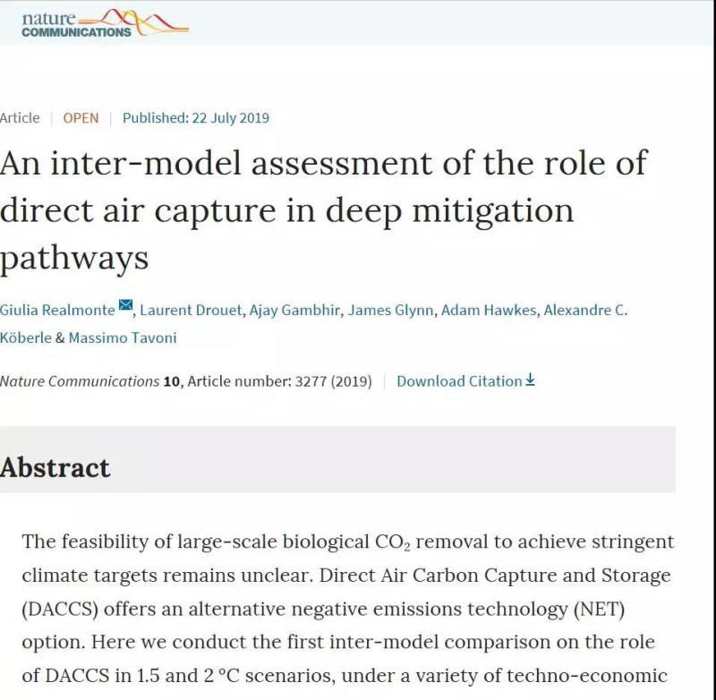 日前《自然·通訊》雜志發(fā)表意大利、英國(guó)等國(guó)學(xué)者的文章認(rèn)為,一種可行的負(fù)排放技術(shù)是直接將二氧化碳從大氣中捕獲,然后將二氧化碳然后埋在地下,該過(guò)程被稱為直接空氣碳捕獲和儲(chǔ)存(as direct air carbon capture and storage ,DACCS)。