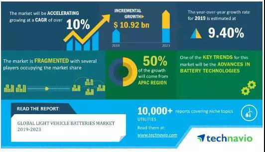 根據(jù)全球研究機(jī)構(gòu)Technavio的報(bào)告透露,2019-2023年期間,全球輕型汽車電池市場規(guī)模將增長109.2億美元,復(fù)合年增長率超過10%。