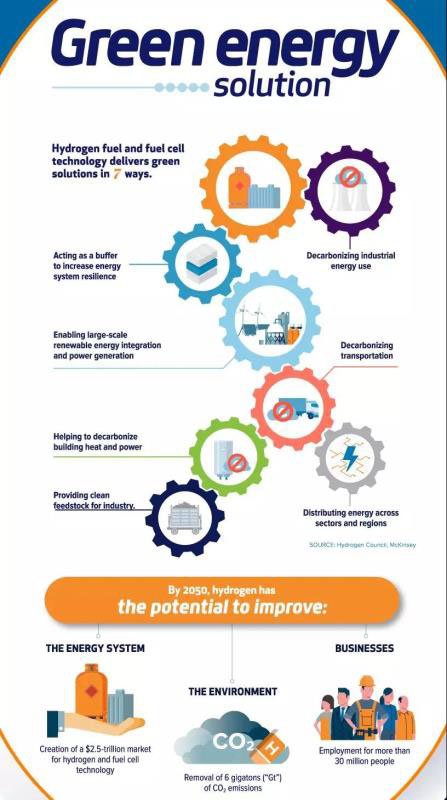 7)為工業(yè)提供清潔原料:目前氫氣作為工業(yè)原料的用量每年超過5500萬噸。氫也可用于生產(chǎn)清潔化學(xué)品和鋼,通過與捕獲的碳一起用作化學(xué)原料并用作鐵礦石的還原劑。