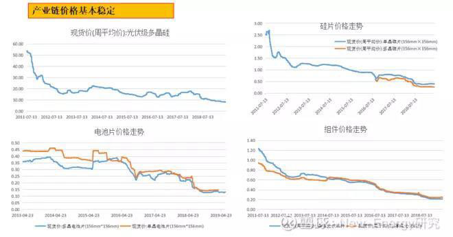 如果從時(shí)間角度來(lái)看,梳理歷年來(lái)光伏成本下降情況對(duì)最終需求的影響持續(xù)時(shí)間的話,一般從一輪成本快速下降之后新增需求能持續(xù)一整年,2016年那輪是,2011-2012年那輪也是,需求恢復(fù)后一般都伴隨著產(chǎn)業(yè)鏈價(jià)格的穩(wěn)定。由于基數(shù)以及成本下降放緩后面一年需求一般都不是都是會(huì)下滑(個(gè)別國(guó)家可能因?yàn)檎叩脑蛴胁町?。那么簡(jiǎn)單拍腦袋的話,由于快速降本出現(xiàn)在18Q3,本輪需求改善應(yīng)該有可能會(huì)持續(xù)到19Q4。
