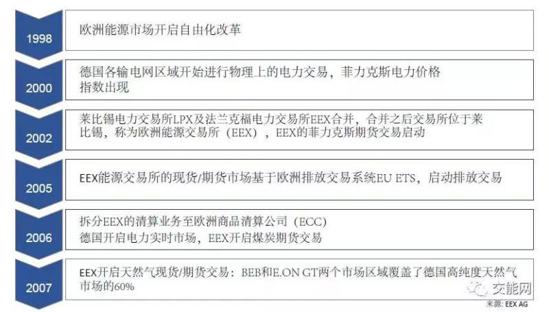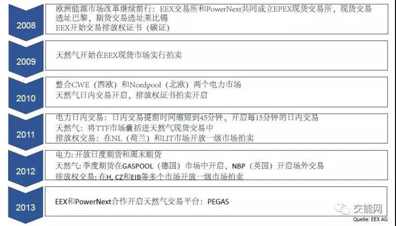 歐洲的能源市場自由化改革始于1998年,這一年是歐洲正式能源市場自由化的元年。其后,電力市場,天然氣市場,甚至包括后來的排放權(quán)市場(碳證交易)都經(jīng)歷了漫長的改革。下面三張圖詳細(xì)的描述了這一改革過程: