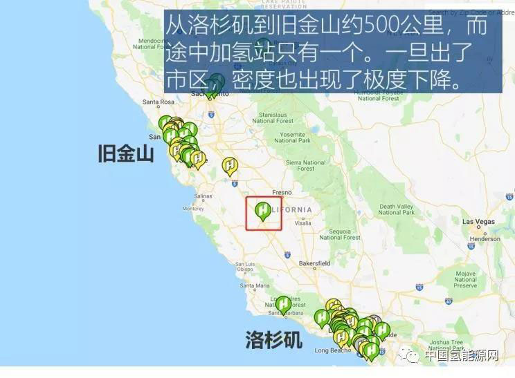 在此行之前,我已經(jīng)對加州地區(qū)加氫站的具體分布有了初步的了解,首先是加氫站的建設(shè)目前還主要集中在南加州,以舊金山和洛杉磯為主要的示范地。同時站點主要分布在了市區(qū)內(nèi),一旦出了市區(qū),數(shù)量開始以個位數(shù)計算,覆蓋密度從市區(qū)內(nèi)的每30公里一個下降到了每300公里一個。