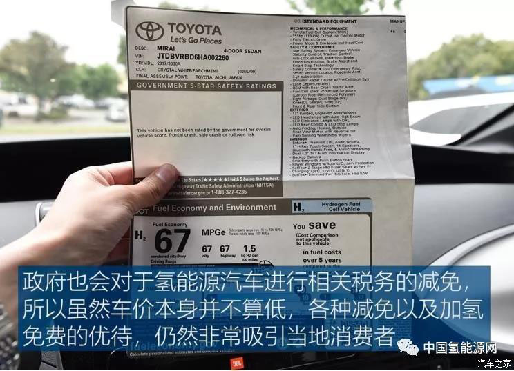 此外,品牌也聯(lián)合政府對消費者在購車方面給出了足夠的優(yōu)惠措施,目前豐田Mirai在美國的單車售價約為40萬人民幣(58385美元),這個價格對于美國汽車市場而言絕對不算低。但為了引導(dǎo)消費,豐田會在用戶購買車輛的同時,附贈一張免費的加氫儲值卡,其中的額度足以支持車輛加注超過1000次,約等于車輛終生都可以免費加氫(以加注一次續(xù)航500公里計算),這對于城市面積巨大的加州地區(qū)而言,對于消費者的誘惑還是很明顯的。