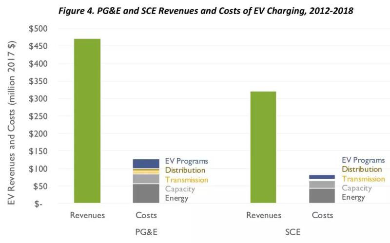 對電力公司而言,電動車是不是“賠本”買賣?美國加利福尼亞州的兩家電力公司——Pacific Gas & Electric和Southern California Edison (SCE)——實際數據來了。在這兩家公司的服務范圍內,約有38萬輛電動汽車。大部分的電動汽車車主在電力需求低谷(夜間)充電,而此時供電公司的供電邊際成本非常低,因此電力公司獲利頗豐。2012-2018年期間,兩家公司因為電動汽車充電獲得的額外售電收入與為電動汽車充電服務付出的成本相比超出5.84億美元。