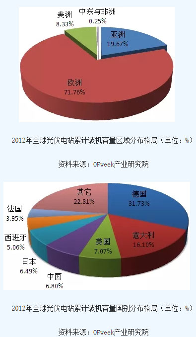 OFweek產(chǎn)業(yè)研究院數(shù)據(jù)顯示,2010年全球光伏發(fā)電總裝機(jī)容量超過(guò)40GW,主要應(yīng)用市場(chǎng)在德國(guó)、西班牙、日本、意大利,其中德國(guó)2010年新增裝機(jī)容量7GW;2011年全球新增光伏發(fā)電裝機(jī)容量超過(guò)30GW,比2010年新增13GW,至2011年底,全球光伏發(fā)電累計(jì)裝機(jī)容量達(dá)到71GW。截至2012年底,全球光伏發(fā)電累計(jì)裝機(jī)容量已超過(guò)100GW,歐洲裝機(jī)規(guī)模占全球總裝機(jī)規(guī)模的70%。其中,德國(guó)光伏電站累計(jì)裝機(jī)容量為32.41GW,占全球的31.73%,是全球累計(jì)裝機(jī)容量最大的國(guó)家;居第二位的是意大利,其光伏電站累計(jì)裝機(jī)容量為16.45GW,占全球的16.10%;居第三、四、五位的分別是美國(guó)、中國(guó)、日本,這三個(gè)國(guó)家光伏電站累計(jì)裝機(jī)容量在7GW左右,分別占7.07%、6.80%和6.49%。