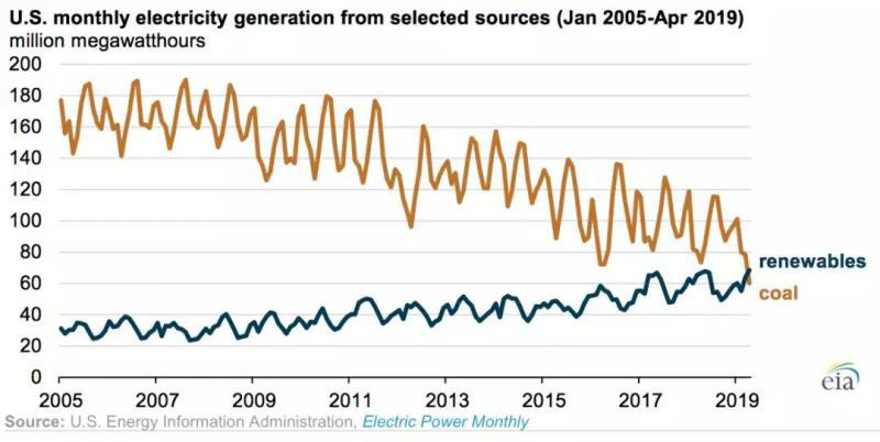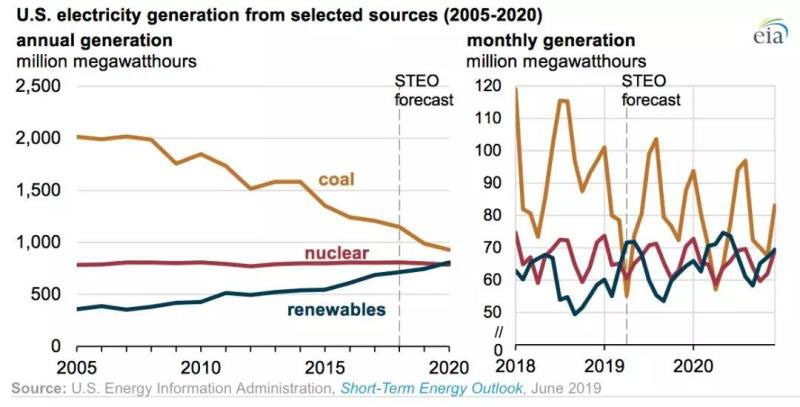 2019年4月這個(gè)月內(nèi),可再生能源發(fā)電比例一度超過了煤電,成為新聞焦點(diǎn)。然而,根據(jù)EIA的預(yù)測(cè),2019年全年煤電比例將有所下降,但將依然大于可再生能源發(fā)電:燃?xì)獍l(fā)電37.1%、煤電24.1%、核電19.5%、可再生能源發(fā)電18.2%,其他1.1%。