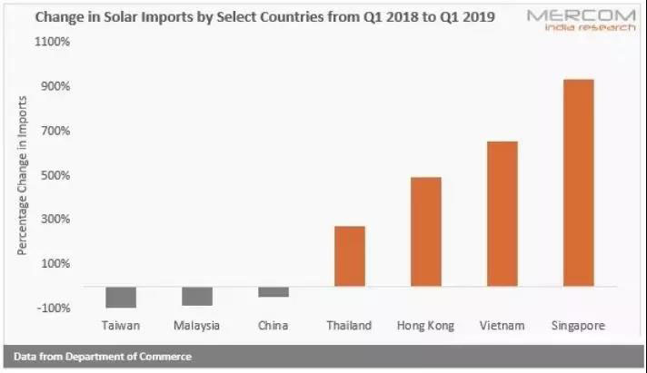 由于印度政府去年開(kāi)始對(duì)從中國(guó)和馬來(lái)西亞進(jìn)口的光伏產(chǎn)品征收25%(2018年7月30日-2019年7月29日)的保障關(guān)稅,第一季度印度光伏產(chǎn)品進(jìn)口同比大幅下降。2019年Q1,印度光伏電池和組件進(jìn)口額約為6.5億美元,2018年同期為11億美元,下降了40%。印度從中國(guó)進(jìn)口了大約5.23億美元的光伏電池和組件產(chǎn)品,但是相比2018年Q1的9.91億美元,同比下降了47%。從中國(guó)進(jìn)口光伏產(chǎn)品的份額也從去年Q1的91.5%下降到了80.5%。