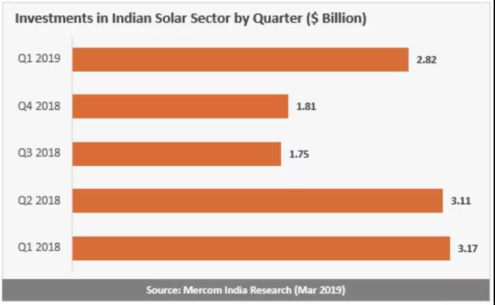 印度如此頻繁的發(fā)布招標(biāo)項(xiàng)目,想必與美國(guó)取消GSP (普惠制),印度政府極力刺激本地光伏生產(chǎn)有關(guān),相比于2018年第四季度,今年一季度的數(shù)字有所進(jìn)步,根據(jù)Mercom 2019年第一季度印度光伏市場(chǎng)季度報(bào)告,截止2019年第一季度末,印度的光伏裝機(jī)容量約為30吉瓦。印度光伏行業(yè)在2019年第一季度的投資總額達(dá)28億美元,該數(shù)字包括制造資金(上游)和項(xiàng)目資金(下游)投資。與2018年第四季度相比,環(huán)比增長(zhǎng)了55%。