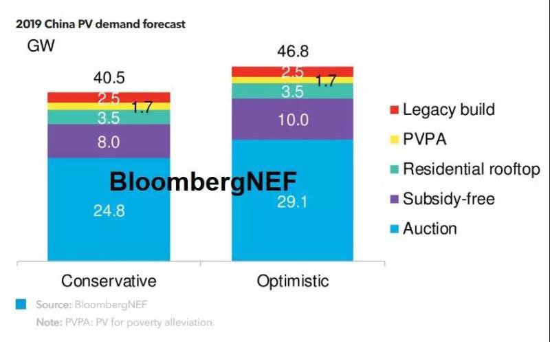 中國(guó)2019年光伏政策驅(qū)動(dòng)市場(chǎng)向兩個(gè)方向發(fā)展,一方面積極推進(jìn)平價(jià)項(xiàng)目的開(kāi)發(fā),另一方面將于年中開(kāi)展大規(guī)模競(jìng)價(jià),分配補(bǔ)貼。BNEF預(yù)測(cè),2019年,中國(guó)光伏新增裝機(jī)容量將在41GW至47GW之間,這將使得下半年全球光伏組件價(jià)格維持在穩(wěn)定水平。