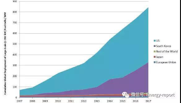 圖2 自2007年以來(lái)大型固定式燃料電池的累計(jì)全球部署(部署數(shù)據(jù)從2000年開(kāi)始考慮),按地區(qū)分類(lèi)