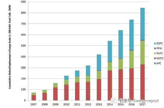 圖1 自2007年以來(lái)大型固定式燃料電池累計(jì)全球部署(部署數(shù)據(jù)從2000年開(kāi)始考慮),按技術(shù)分類(lèi)
