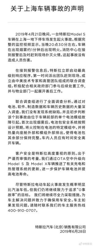 面對車主和社會(huì)對自燃事故的質(zhì)疑,6月28日下午,特斯拉汽車(北京)銷售有限公司公布《關(guān)于上海車輛事故的聲明》,對在今年4月21日發(fā)生在上海地下車庫的特斯拉電動(dòng)汽車自燃事故,作出回應(yīng)。