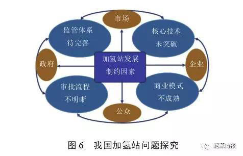 2017年我國燃料電池汽車產(chǎn)量達到1275輛,2018年1~11月產(chǎn)量為465輛。截至2018年12月,我國有41家整車企業(yè)開始研發(fā)燃料電池汽車,燃料電池汽車產(chǎn)業(yè)在我國才剛剛起步。加氫站布局發(fā)展體系尚未成形,對標(biāo)國外加氫站布局發(fā)展情況,正視我國加氫站布局發(fā)展現(xiàn)狀,從立項審批、布局建設(shè)以及運營管理等發(fā)展環(huán)節(jié)出發(fā),全視角剖析加氫站目前存在的問題,歸納總結(jié)出監(jiān)管體系待完善、審批流程不明晰、商業(yè)模式不成熟、核心技術(shù)未突破等四大主要問題,如圖6所示。立足問題根源,破解發(fā)展困局,有利于加快我國加氫站發(fā)展體系成形,促進氫能及燃料電池汽車產(chǎn)業(yè)可持續(xù)發(fā)展。