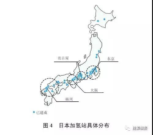 受限于大部分化石能源依賴于進口的現(xiàn)狀,日本極其重視氫能產(chǎn)業(yè)的發(fā)展,并將氫能列為極其重要的戰(zhàn)略能源,同時日本認為氫能與燃料電池汽車產(chǎn)業(yè)是實現(xiàn)3E(環(huán)境保護、能源安全、經(jīng)濟增長)目標(biāo)的有力方式。日本是全球加氫站建設(shè)數(shù)量最多的國家,截至2018年2月,已達101座,其中39座移動加氫站,62座固定加氫站,加氫站可在70MPa壓力標(biāo)準下,3min左右加注5kg氫氣。加氫站主要圍繞東京、大阪、名古屋、福岡四大都市區(qū)而建,由大城市向周圍地區(qū)輻射,形成了區(qū)域聯(lián)動加氫網(wǎng)絡(luò),其中部分采取分時開放模式,以確保商業(yè)運營經(jīng)濟性。日本加氫站具體分布如圖4所示。