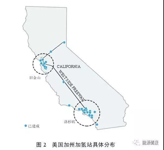 為調(diào)整能源結(jié)構(gòu),構(gòu)建低碳社會,美國加州陸續(xù)出臺了零排放汽車法規(guī)和低碳積分等激勵政策,將燃料電池汽車作為汽車產(chǎn)業(yè)的重要發(fā)展方向。燃料電池汽車的發(fā)展促進了加氫站的建設(shè),發(fā)達的加氫網(wǎng)絡(luò)又保障了燃料電池汽車的自由出行。截至2018年12月25日,美國加氫站已達37座,且大部分位于加州地區(qū)。加州地區(qū)的加氫站全部對外開放,供應(yīng)規(guī)模在100~350kg/天,并可實現(xiàn)35MPa/70MPa雙壓力加注,具體分布如圖2所示。加州發(fā)達的加氫網(wǎng)絡(luò)主要取決于精準的布局模型、完善的商業(yè)模式以及政府的政策支持。其布局依據(jù)加州大學(xué)STREET模型,基于市場分析、土地利用、交通路網(wǎng)和駕駛可達等基本要素進行綜合優(yōu)化,確定加氫站位置和數(shù)量,精準布局加氫站網(wǎng)絡(luò)。