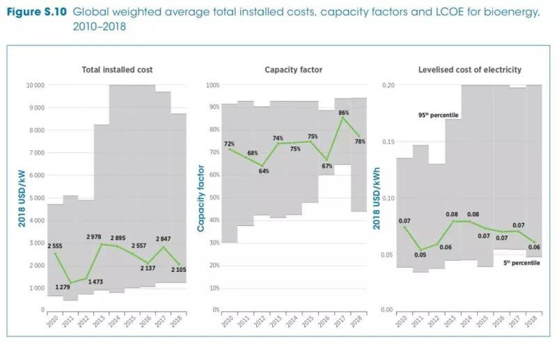 國際可再生能源署發(fā)布最新的可再生能源發(fā)電成本報告,2010-2018年全球生物質(zhì)發(fā)電項目加權(quán)平均的單位投資成本、容量系數(shù)、平準(zhǔn)化成本走勢如下(以2018年美元計):