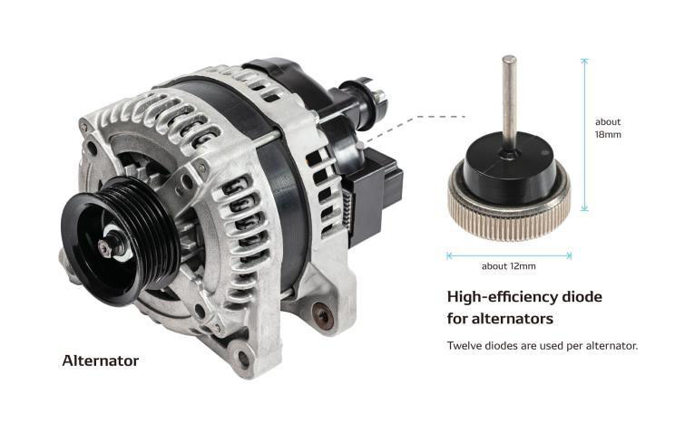 二極管是交流發(fā)電機(jī)的組件之一,具有在一定方向上流動(dòng)電流并將產(chǎn)生的交流電整流為直流電的功能。雙方共同開(kāi)發(fā)的二極管通過(guò)提高功能效率顯著降低了功率轉(zhuǎn)換損耗。與傳統(tǒng)產(chǎn)品相比,新二極管可將發(fā)電效率提高約6%,并有助于提高燃油消耗。
