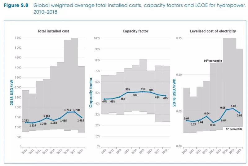 國際可再生能源署發(fā)布最新的可再生能源發(fā)電成本報告,2010-2018年全球水電項目加權(quán)平均的單位投資成本、容量系數(shù)、平準(zhǔn)化成本走勢如下(以2018年美元計):