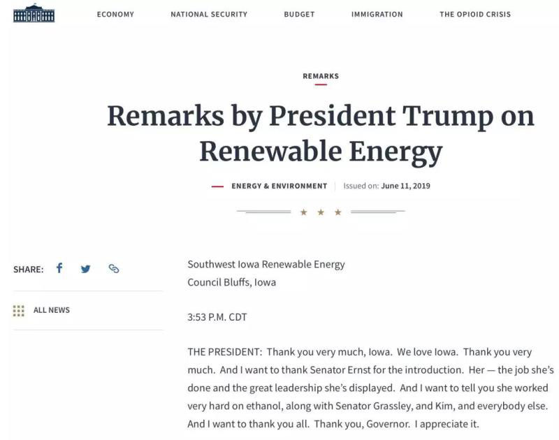 白宮網(wǎng)站貼出特朗普的一篇講話,題為“特朗普總統(tǒng)關(guān)于可再生能源的講話“(Remarks by President Trump on Renewable Energy)。這是6月11日特朗普在艾奧瓦州對(duì)當(dāng)?shù)卣?、農(nóng)業(yè)領(lǐng)域人士的講話,名為”可再生能源“,卻只字不提風(fēng)電、光伏或者水電、地?zé)幔ㄆ际巧镆掖?。特朗普講話部分內(nèi)容如下: