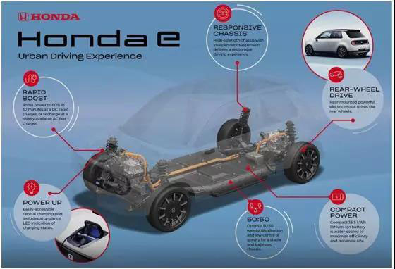 本田e平臺是全新打造的純電動車平臺,專注于城市環(huán)境,提供有益的,響應迅速的駕駛體驗。為實現(xiàn)這一目標,工程師們將35.5千瓦時的鋰電池放置在軸距的中央位置。這種智能集成可實現(xiàn)50:50的完美重量平衡和低重心,實現(xiàn)最佳操控性和穩(wěn)定性。高扭矩電動機的動力通過后輪傳遞,即使在高加速度下也能實現(xiàn)精度轉(zhuǎn)向。