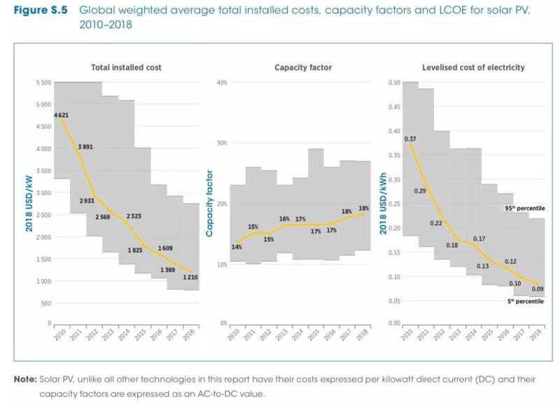 國際可再生能源署發(fā)布最新的可再生能源發(fā)電成本報告,2010-2018年全球光伏項目加權(quán)平均的單位投資成本、容量系數(shù)、平準(zhǔn)化成本走勢如下(以2018年美元計):