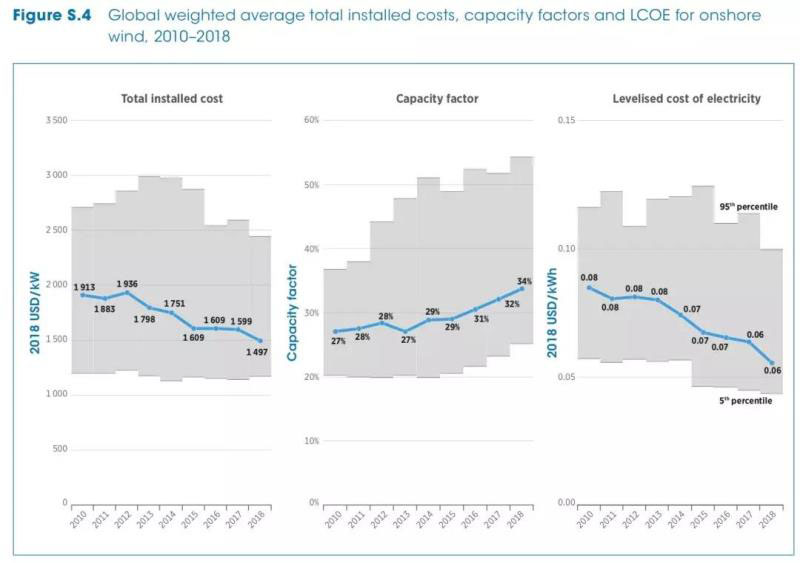 國際可再生能源署發(fā)布最新的可再生能源發(fā)電成本報告,2010-2018年全球陸上風電項目加權(quán)平均的單位投資成本、容量系數(shù)、平準化成本走勢如下(以2018年美元計):