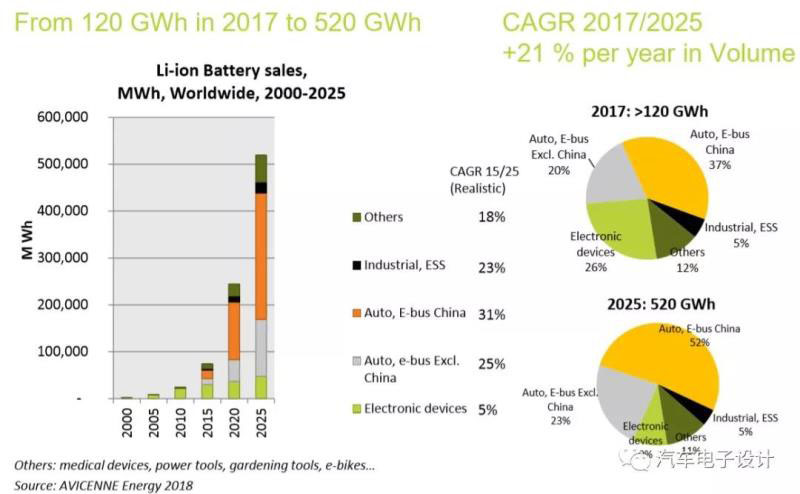 AVICENNE把全球動力電池的增量需求,主要是分析來自中國的乘用車和商用車,與之相比全球其他地區(qū)的動力電池需求大概是這個1/3,而工業(yè)應(yīng)用(各類工具+ESS)全部加上也就是和消費類的相比擬。