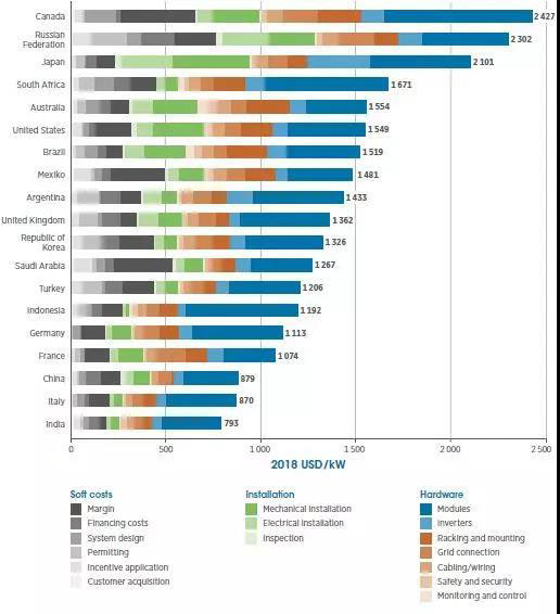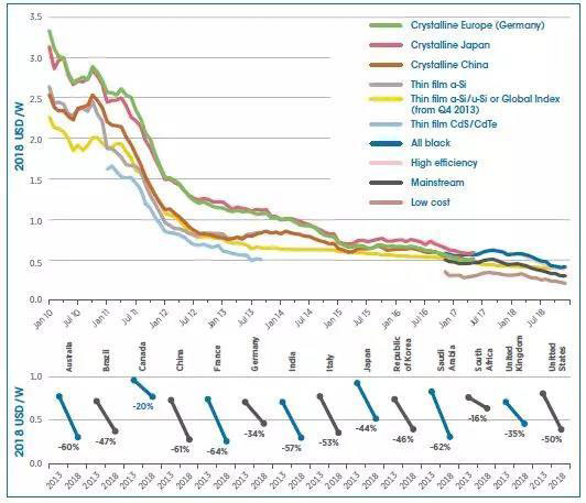 上圖的上半部分為2018年1月到7月的光伏制造業(yè)不同環(huán)節(jié)、不同生產(chǎn)地的成本??梢钥吹?,光伏不同環(huán)節(jié)的成本在短短的半年中均出現(xiàn)了一定程度的下降。下部分為2013到2018年全球主要發(fā)展光伏的國(guó)家光伏組件的成本下降程度。