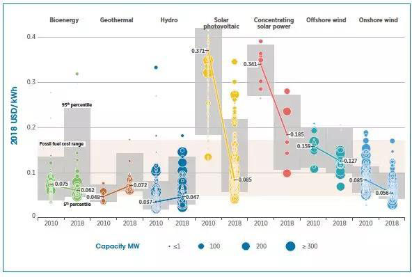 下圖把全球可再生能源2010年到2018年的平均平準(zhǔn)化成本可視化了,粉色區(qū)域?yàn)榈陀谧畋阋说幕茉窗l(fā)電的成本區(qū)間。可以看到,經(jīng)過(guò)八年的發(fā)展,除了太陽(yáng)能光熱略高于化石能源的最低成本外,其他類型的可再生能源的全球平均平準(zhǔn)化成本已經(jīng)比可再生能源低。