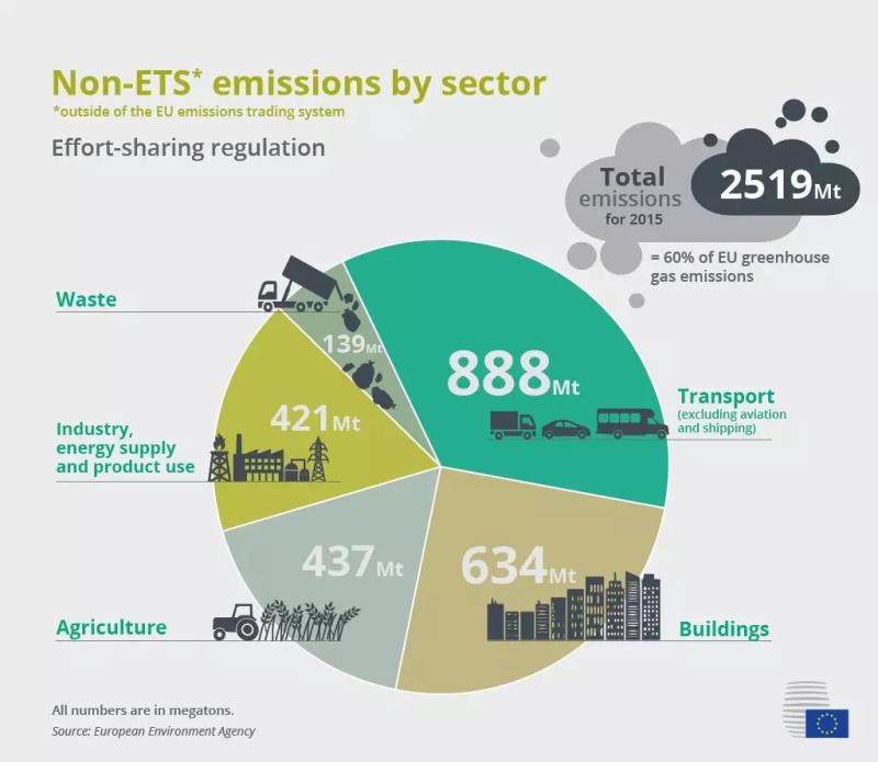 歐盟國家的溫室氣體排放限制是在兩個(gè)不同的框架內(nèi)設(shè)定和實(shí)施的,即所謂的“碳排放交易體系”(ETS)和“非ETS”部門。2015年非ETS部門排放高達(dá)25.19億噸(約占?xì)W洲碳排放的60%),其中交通8.88億噸、建筑6.34億、農(nóng)業(yè)4.37億噸、中小型工業(yè)4.21億噸、垃圾1.39億噸。
