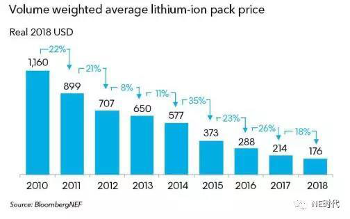 電池價(jià)格將一直處在下降通道中,2018年P(guān)ACK級(jí)別的價(jià)格為176美元/kWh,到2025年將降到87美元/kWh,到2030年再降至62美元/kWh。