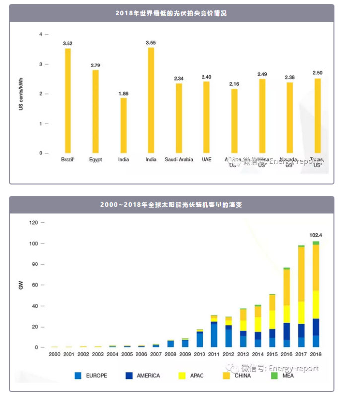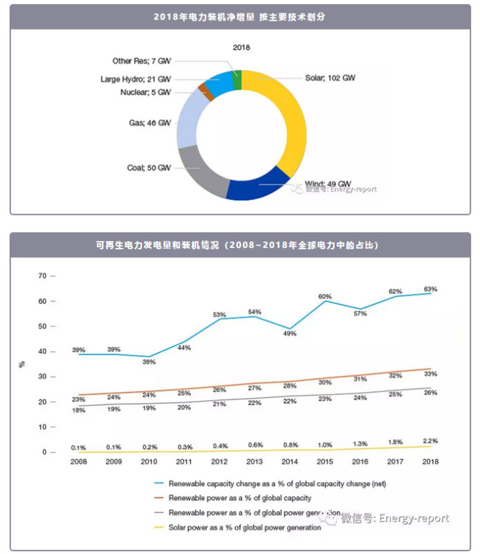 盡管光伏同比增長(zhǎng)較低,僅為個(gè)位數(shù),但它再次成為2018年全球裝機(jī)增幅最大的發(fā)電技術(shù)。部署的太陽能光伏裝機(jī)比任何其他單一技術(shù)都多。事實(shí)上,2018年太陽能光伏裝機(jī)的凈增量是當(dāng)年煤電和風(fēng)電裝機(jī)凈增量的兩倍還要多。與前一年一樣,2018年太陽能光伏裝機(jī)比所有化石燃料和核電的新增裝機(jī)總量都要高,盡管領(lǐng)先得并不多(不到1%)。與化石燃料發(fā)電裝機(jī)相比,太陽能光伏的新增裝機(jī)似乎令人印象深刻,但事實(shí)是,太陽能要挖掘其巨大的潛力還有很長(zhǎng)的路要走—它在2018年全球發(fā)電量中的占比很小,僅為2%。